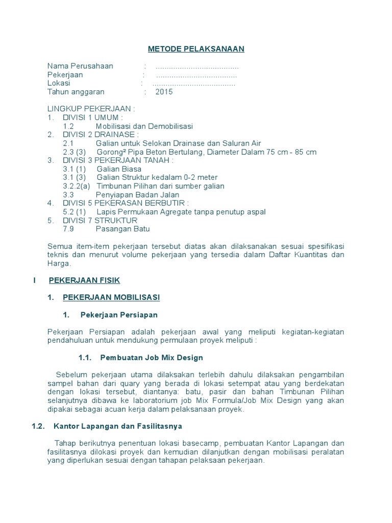 Metode Pelaksanaan from imgv2-1-f.scribdassets.com Pada dasarnya metode pelaksanaan konstruksi merupakan penerapan konsep rekayasa yang berpijak pada keterkaitan antara persyaratan dalam dokumen pelelangan. Metode pelaksanaan untuk bangunan gedung berbeda dengan metode pekerjaan bangunan irigasi, bangunan pembangkit listrik, kontruksi dermaga, maupun konstruksi jalan dan jembatan. Disini saya akan menjelaskan metode pelaksanaan pekerjaan beton duiker teknis pelaksanaan pekerjaan a. Untuk balok, plat lantai, plat lantai dan tangga bekesting dikerjakan dahulu baru setelah itu dilanjutan dengan pembesian tulangan. Pembesian plat lantai beton jembatan juga menggunakan besi ulir dan dilaksanakan dengan sistem serempak untuk semua unit. Tujuan dan metode pelaksanaan diklat. Untuk mengetahui metode pekerjaan kolom, balok dan plat lantai. Inilah metode pelaksanaan pekerjaan beton bertulang.